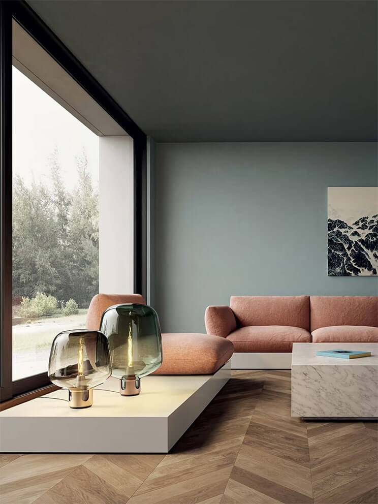 Flar is verkrijgbaar in twee maten, medium en large, met een hoogte van respectievelijk 47 cm en 62,5 cm. De basis is afgewerkt in de kleuren terra of pearl, terwijl de glazen kap honingkleurig of turquoise is.