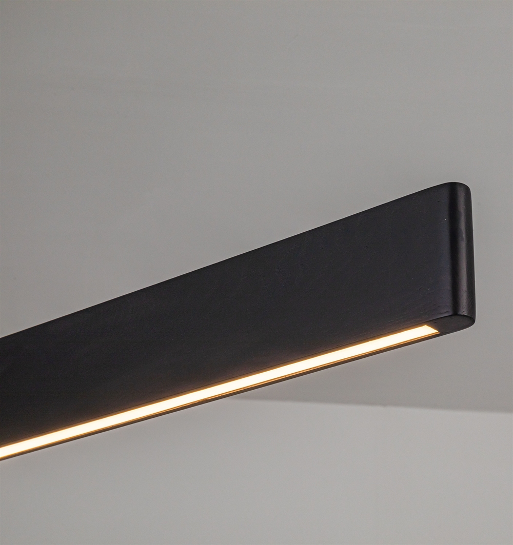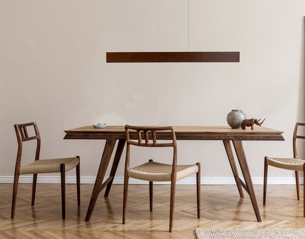 De hanglamp is verkrijgbaar met twee verschillende houtafwerkingen – walnoot met een warme, donkere gloed of zwart essenhout, dat zorgt voor een modernere uitstraling.