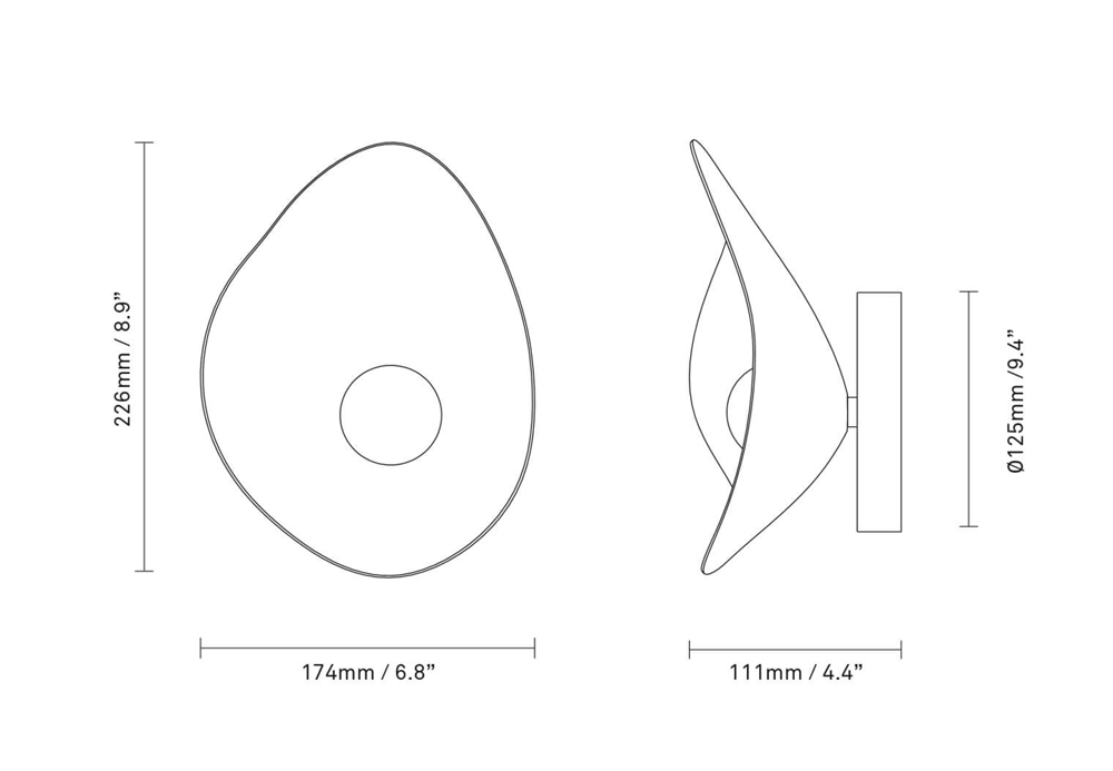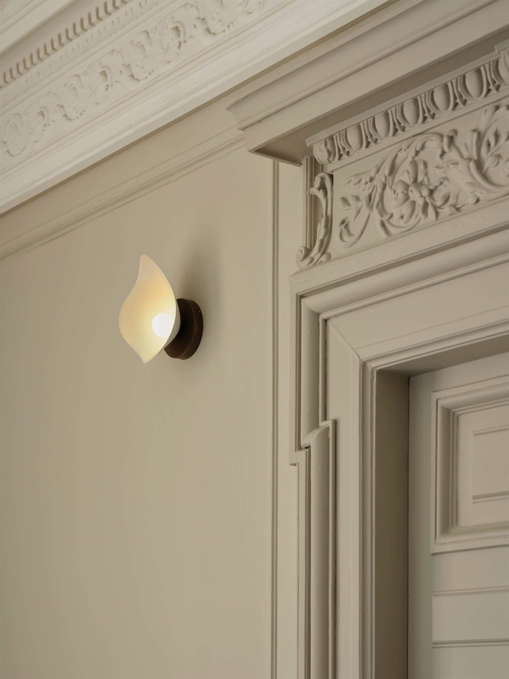 Het ontwerp voor Florii 1 is geïnspireerd op een wandeling door het bos op een heldere herfstdag, waar zonlicht door de vallende bladeren danste. Het resultaat is een unieke wandlamp met een prachtig spel tussen licht en schaduw van de bloembladvormige kap. De elegante wandlamp met een basis van metaal, gepoedercoat in donker bronskleur en een kap van opaalglas, past in veel moderne interieurs.