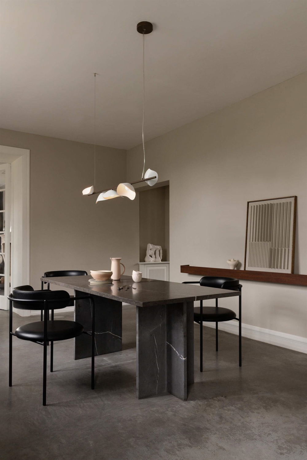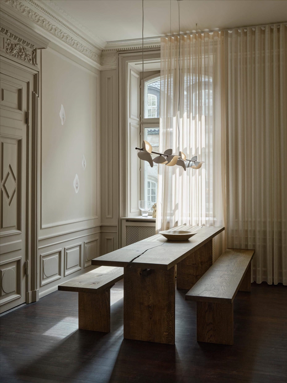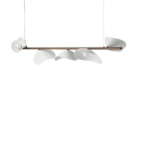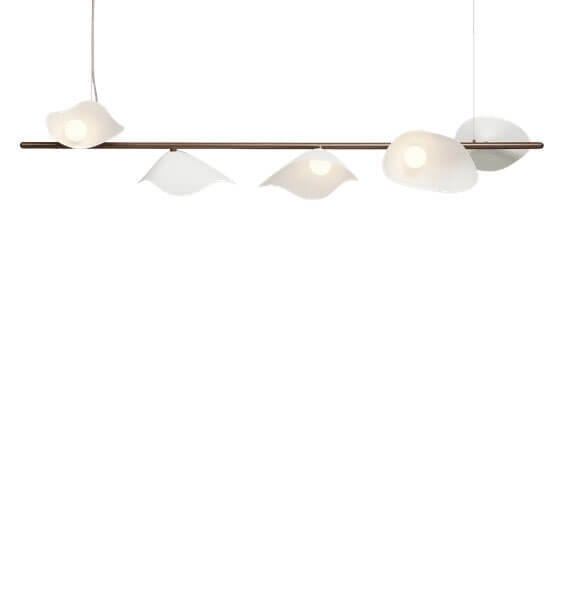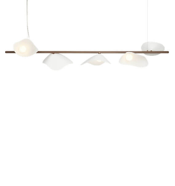 Ontworpen voor de hanglamp Florii 5, geïnspireerd door een wandeling door het bos op een heldere herfstdag, waar zonlicht danste door de vallende bladeren. Het resultaat is een unieke hanglamp met een prachtig spel tussen licht en schaduw van de vijf bloembladvormige kappen, die zijn gemonteerd op de lineaire ophanging. De elegante langwerpige hanglamp met ophanging in metaal, gepoedercoat in donker bronskleur en kappen in opaalglas, past in veel moderne interieurs, bijvoorbeeld alleen of twee in verlenging van elkaar boven de eettafel.