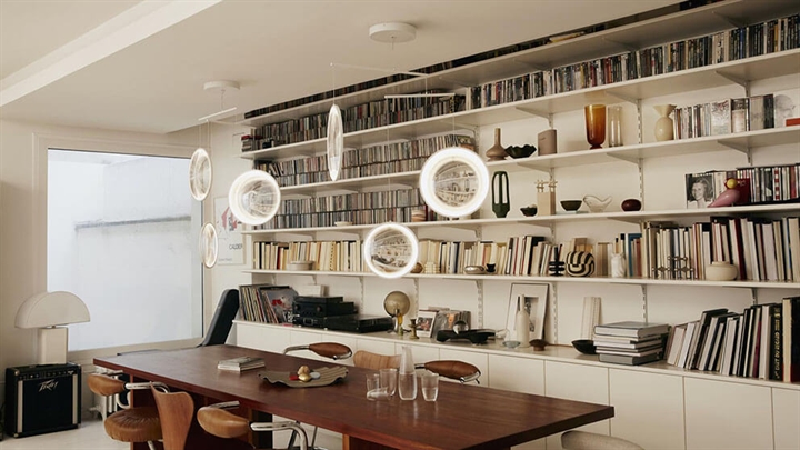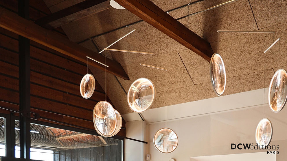 De hanglamp is verkrijgbaar in zwart of wit met 3 of 4 lichtgevende schijven en in zwart, wit of goud met 5 lichtgevende schijven.