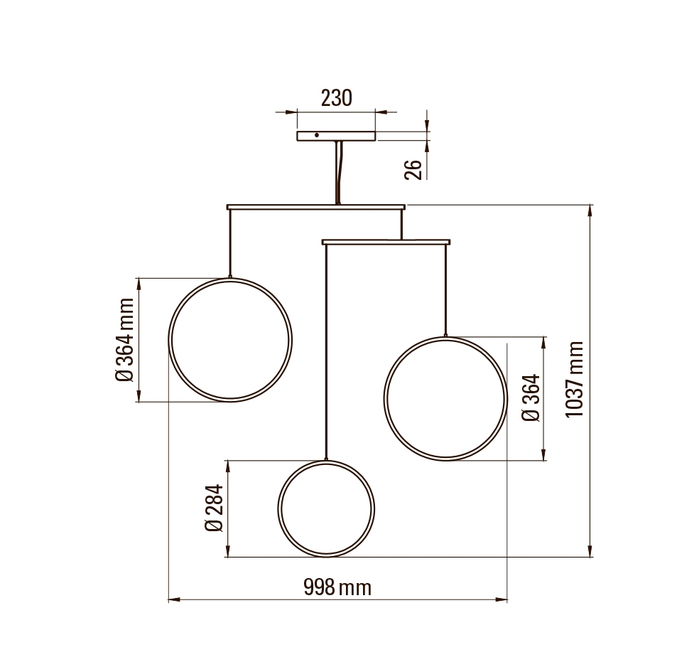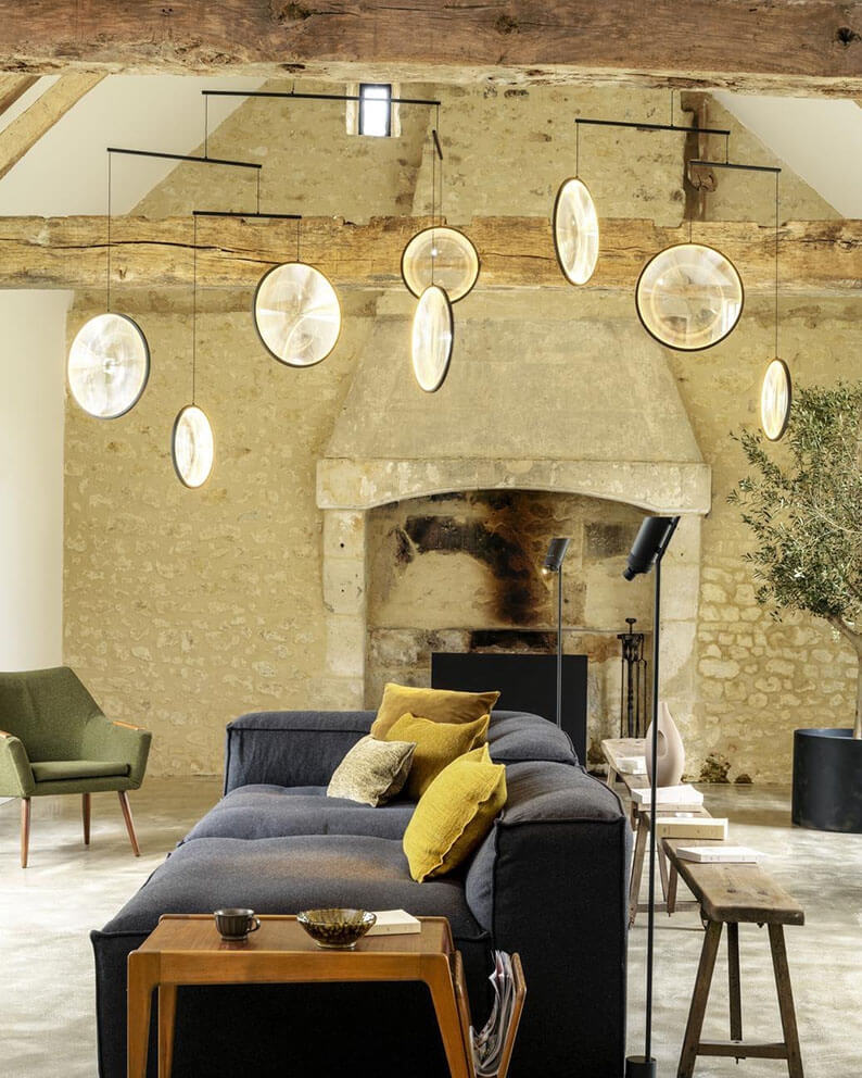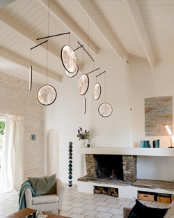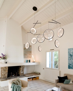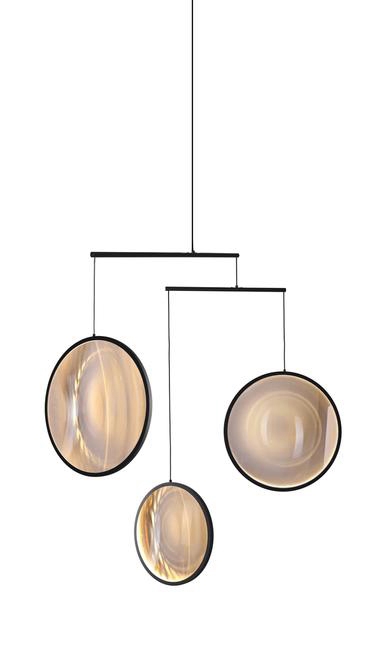 De hanglamp is verkrijgbaar in zwart of wit met 3 of 4 lichtgevende schijven en in zwart, wit of goud met 5 lichtgevende schijven.