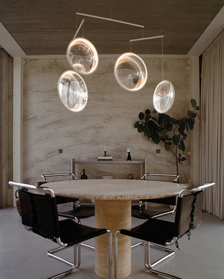 De hanglamp is verkrijgbaar in zwart of wit met 3 of 4 lichtgevende schijven en in zwart, wit of goud met 5 lichtgevende schijven.