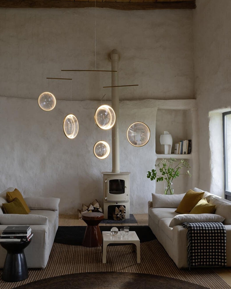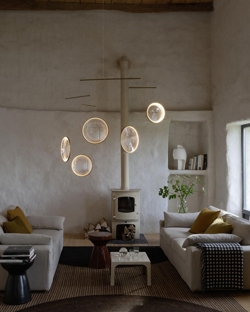 De hanglamp is verkrijgbaar in zwart of wit met 3 of 4 verlichte schijven en in zwart, wit of goud met 5 verlichte schijven.