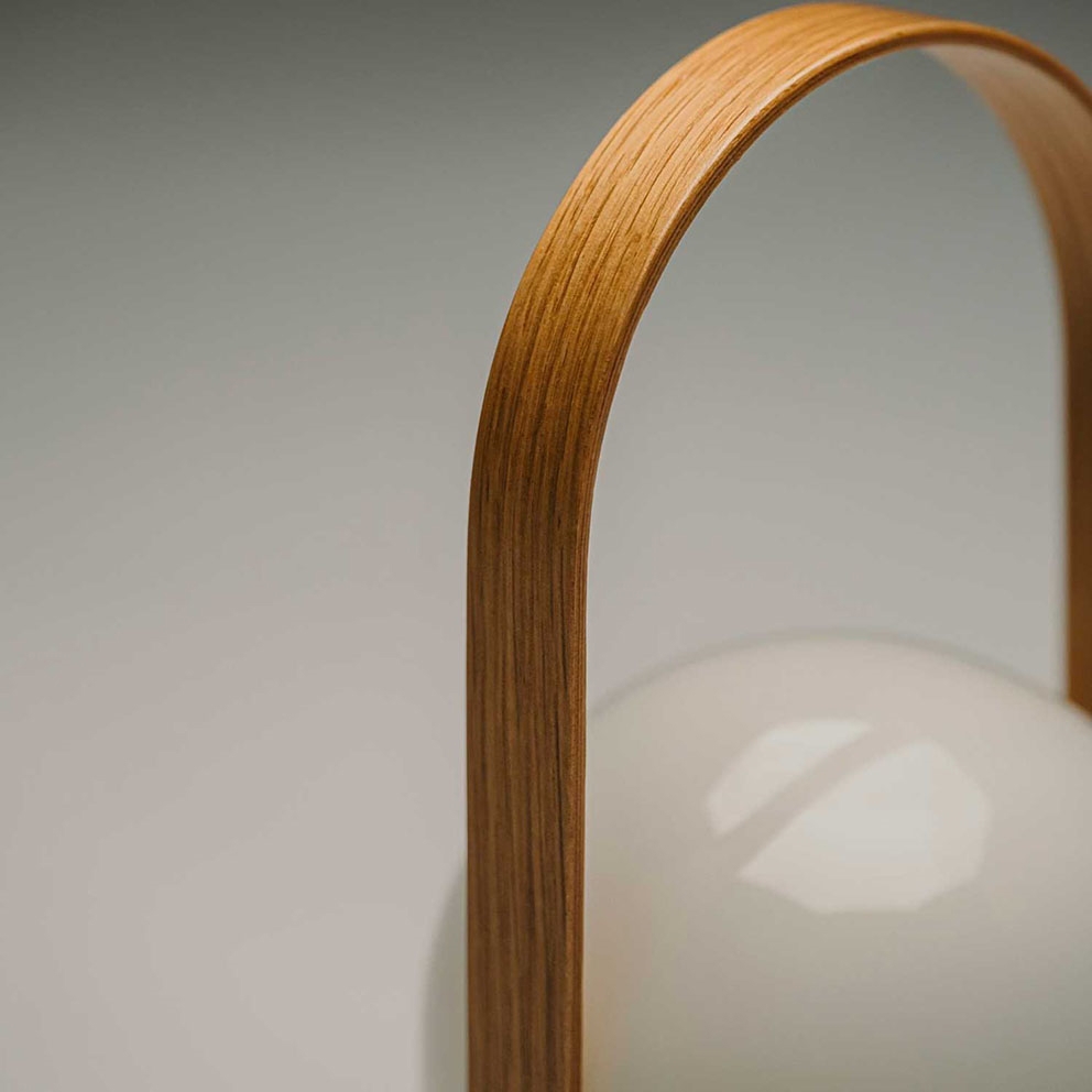 FollowMe Glossy is gemaakt van glanzend ivoorwit polycarbonaat met diffuser in glanzend opaal polycarbonaat en handvat in fineer met natuurlijke eikenlak. De materialen vullen elkaar goed aan en dragen bij aan het creëren van het karakteristieke, lichte en compacte ontwerp van de lamp.