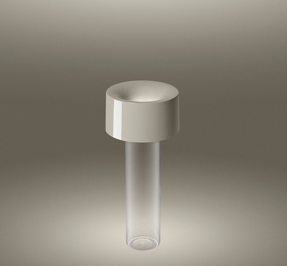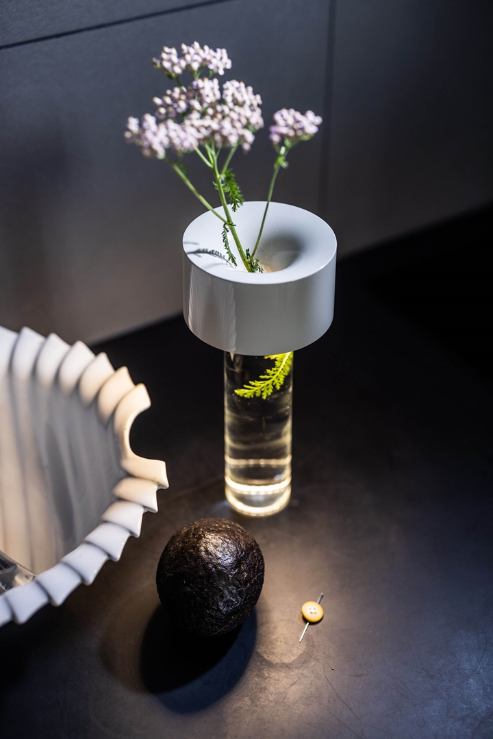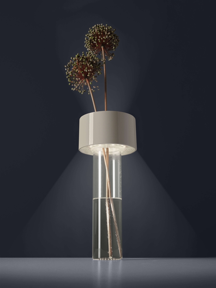 Batterijlamp Fleur is een oplaadbare tafellamp met een neerwaarts licht, die naast sfeerverlichting ook kan worden gebruikt als een vaas die met water kan worden gevuld. De lamp bestaat uit een cilindrische basis van glas en een effen bovenkant met de LED-lichtbron en is dimbaar in drie stappen. Hij kan 7 uur branden op 100 procent, 9 uur op 70 procent en 13 uur op 30 procent.
