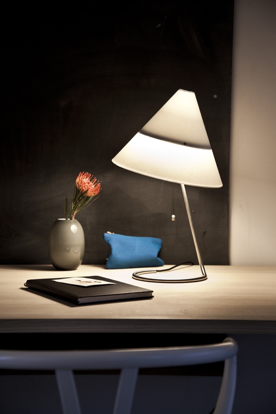 De tafellamp is uiterst functioneel, omdat de kap kan worden gekanteld, zodat het licht in alle richtingen kan worden verspreid. Wanneer Funco is uitgeschakeld, is de kap volledig wit, maar wanneer de lamp wordt ingeschakeld, wordt de kap op de mooiste manier tweekleurig.