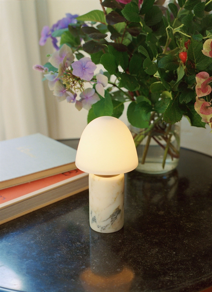 De draagbare tafellamp Fuse Portable heeft een klassiek ontwerp gemaakt van duurzame materialen zoals calacatta viola marmer, gebronsd messing, drielaags opaalglas en albast. De geïntegreerde LED-lichtbron is geplaatst achter het doorschijnende deksel van albast en biedt met het verfijnde ontwerp met opaalglazen kap een aangename verlichting, die in drie stappen dimbaar is.