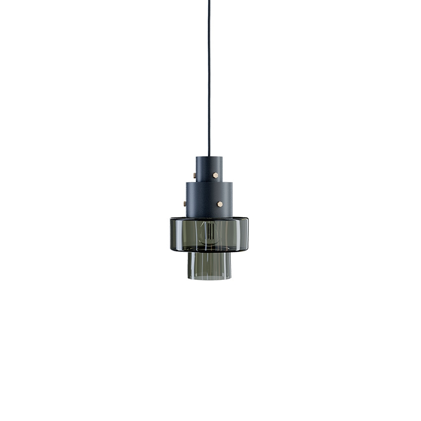 De lamp is ontworpen in een ruwe stijl met mooie en sterke contrasten – zwart staal, messing bouten en glas dat de lichtbron aan de onderkant toont.