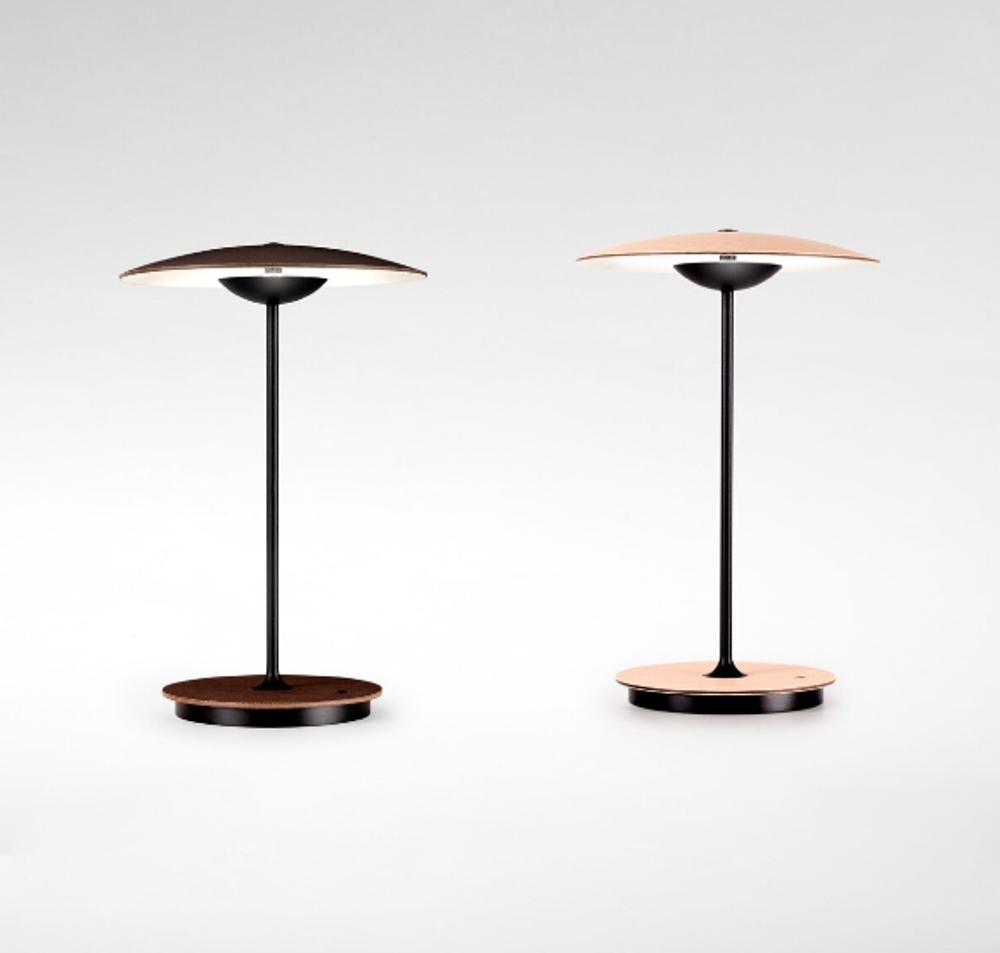 Ginger 20 M is een draagbare tafellamp. Ginger 20 M is een draagbare tafellamp met een houten kap van slechts 4 mm dik. Het frame is van aluminium en er is een ingebouwde 3,2 watt LED-lichtbron - en hij kan worden ingesteld op 3 lichtniveaus.