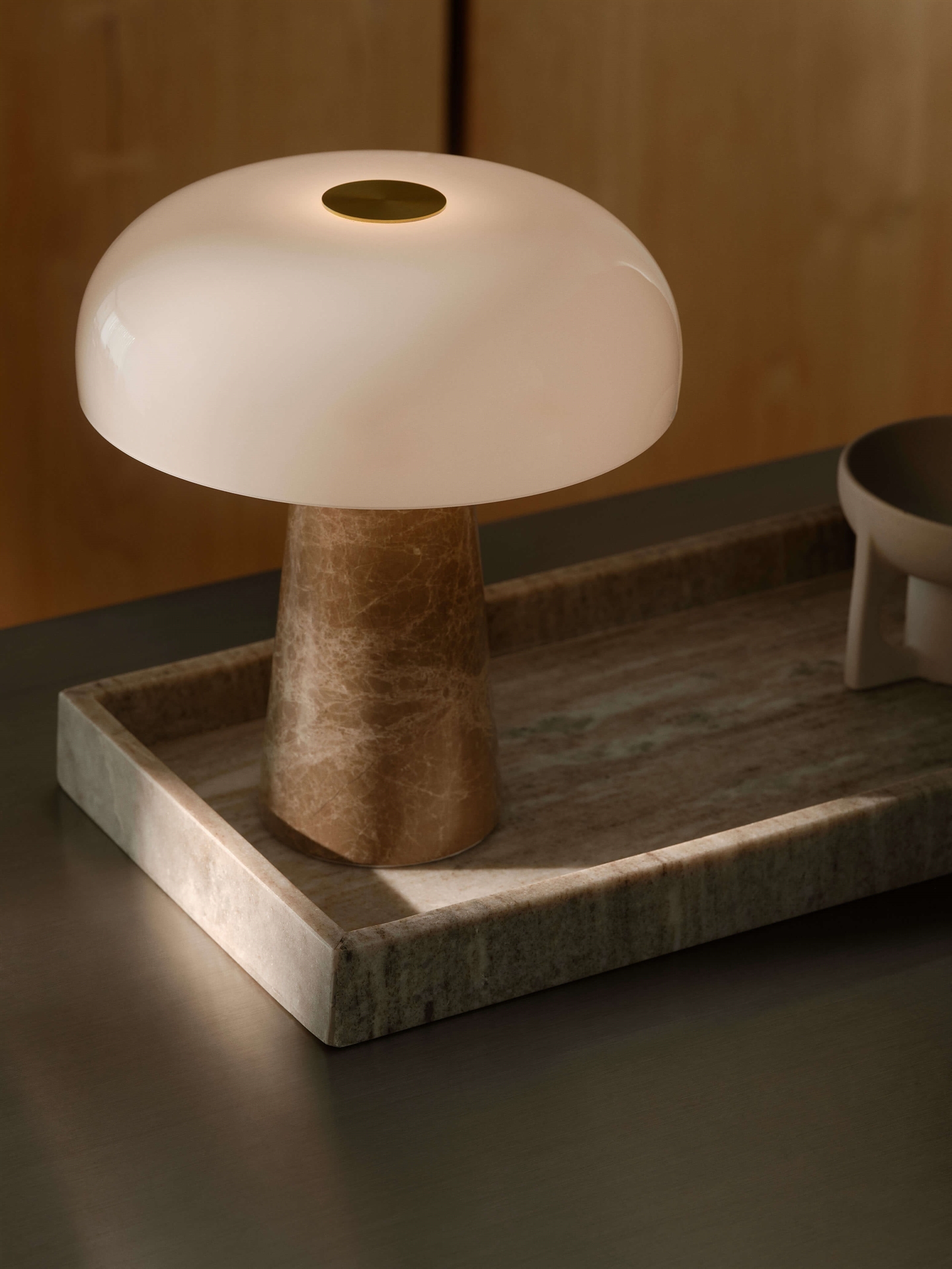 Glossy Mini is een elegante tafellamp met een prachtige marmeren voet en een top van geborsteld messing. De lamp is ontworpen door de Deense designer Maria Berntsen, die een minimalistisch Scandinavisch design wilde creëren met gebruik van hoogwaardige materialen, waardoor elke lamp uniek is.