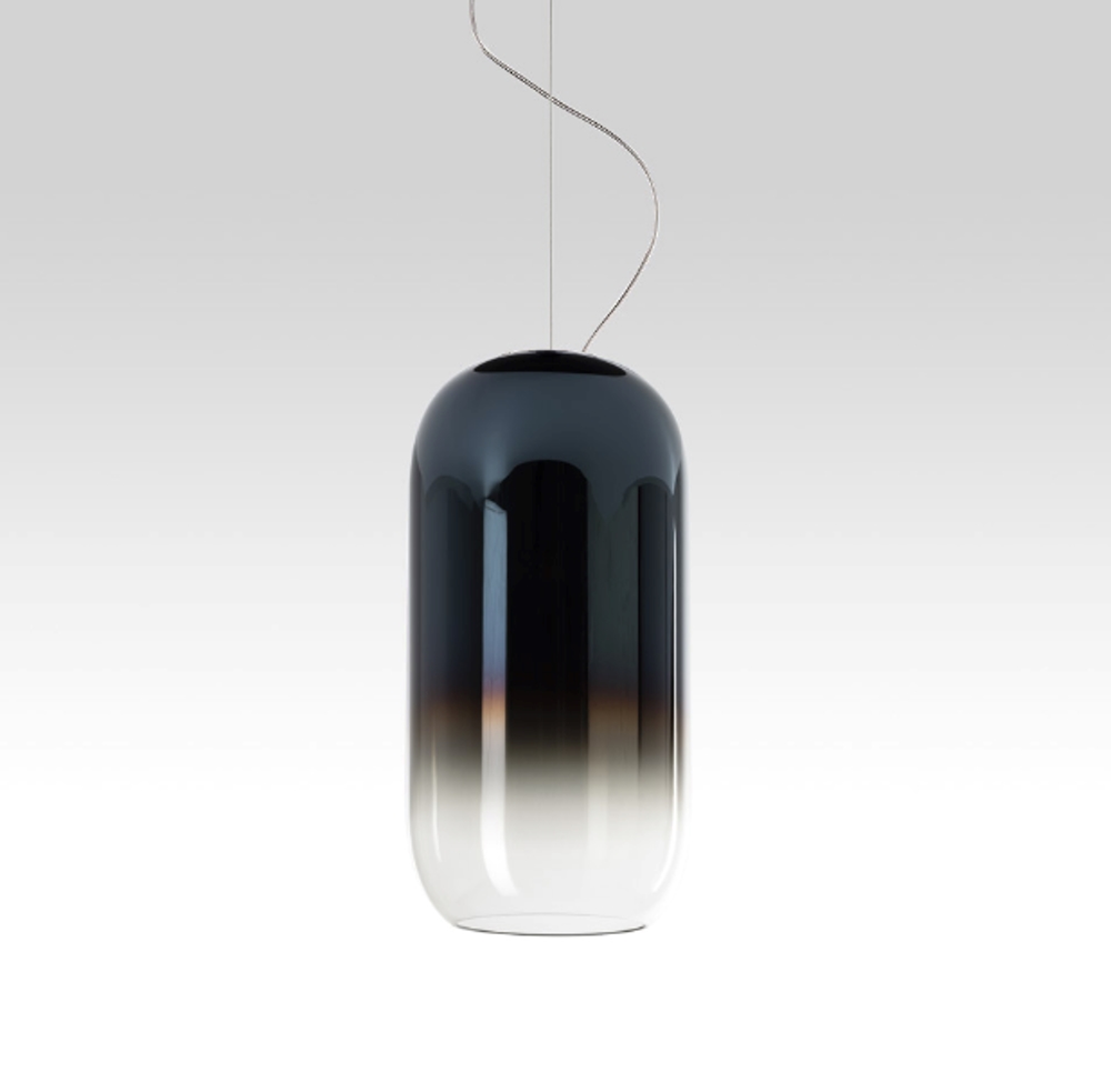 De basisvorm van de Gople-lamp benadrukt de schoonheid van het glas, dat met de hand is vervaardigd volgens een oude Venetiaanse techniek. Hier wordt wit glas omgezet in kristalglas door beide te combineren tijdens het blazen - zo wordt elk glas uniek.