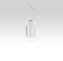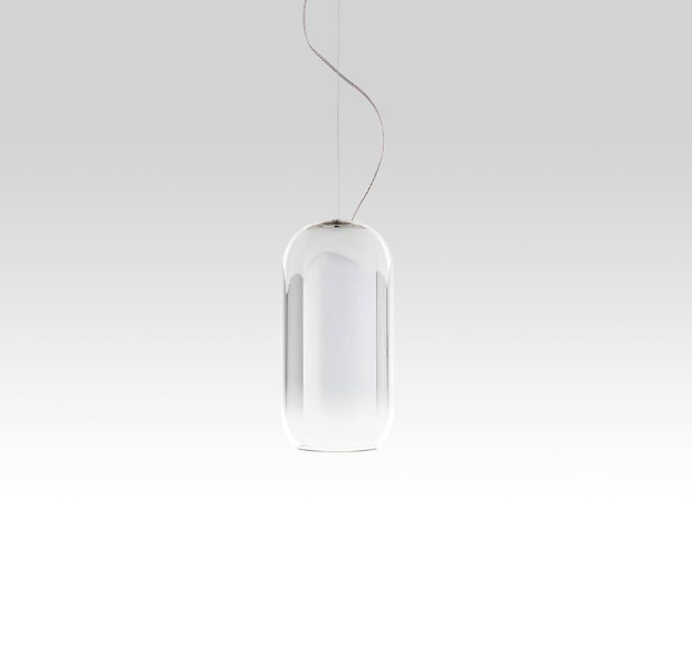 De basisvorm van de Gople-lamp brengt de schoonheid van het glas naar voren, dat met de hand is bewerkt volgens een oude Venetiaanse techniek. Hier wordt wit glas omgezet in kristalglas door beide te combineren tijdens het blazen - hierdoor wordt elk glas uniek.
