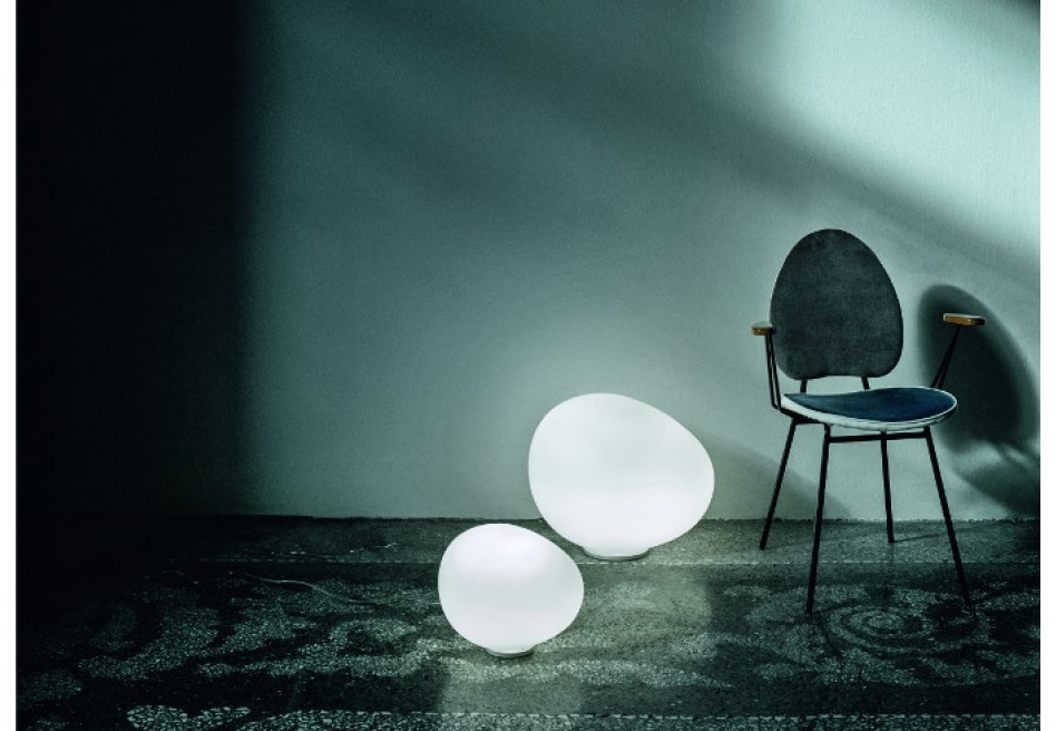 Het lampenkapje van Gregg media is geïnspireerd op strandstenen die door het water rond en zacht zijn geslepen. De lampenkap is gemaakt van mondgeblazen glas.