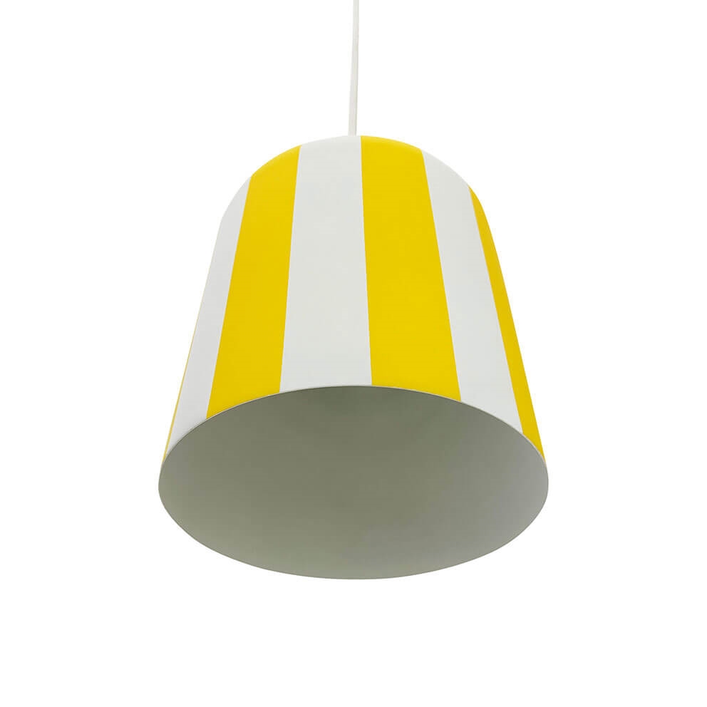 De Gry hanglamp is verkrijgbaar in wit met strepen in rood, geel of grijs en als tafellamp in dezelfde kleuren.