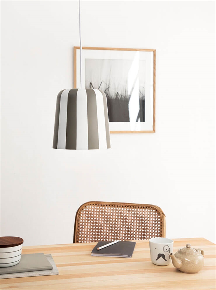 De Gry hanglamp is verkrijgbaar in wit met strepen in rood, geel of grijs en als tafellamp in dezelfde kleuren.