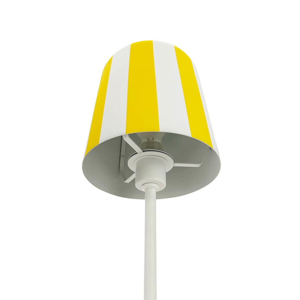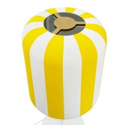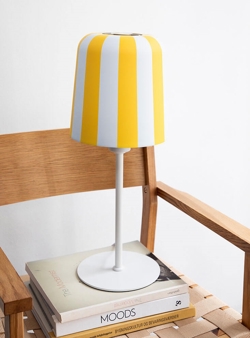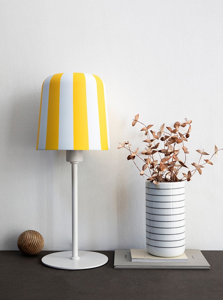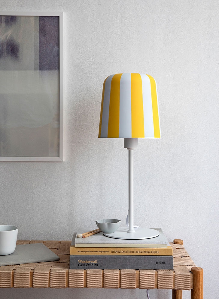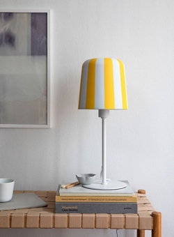 Gry tafellamp is verkrijgbaar in wit met strepen in rood, geel of grijs en als hanglamp in dezelfde kleuren.