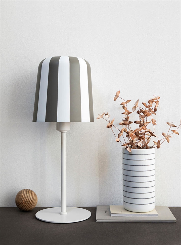 Gry tafellamp is verkrijgbaar in wit met strepen in rood, geel of grijs en als hanglamp in dezelfde kleuren.