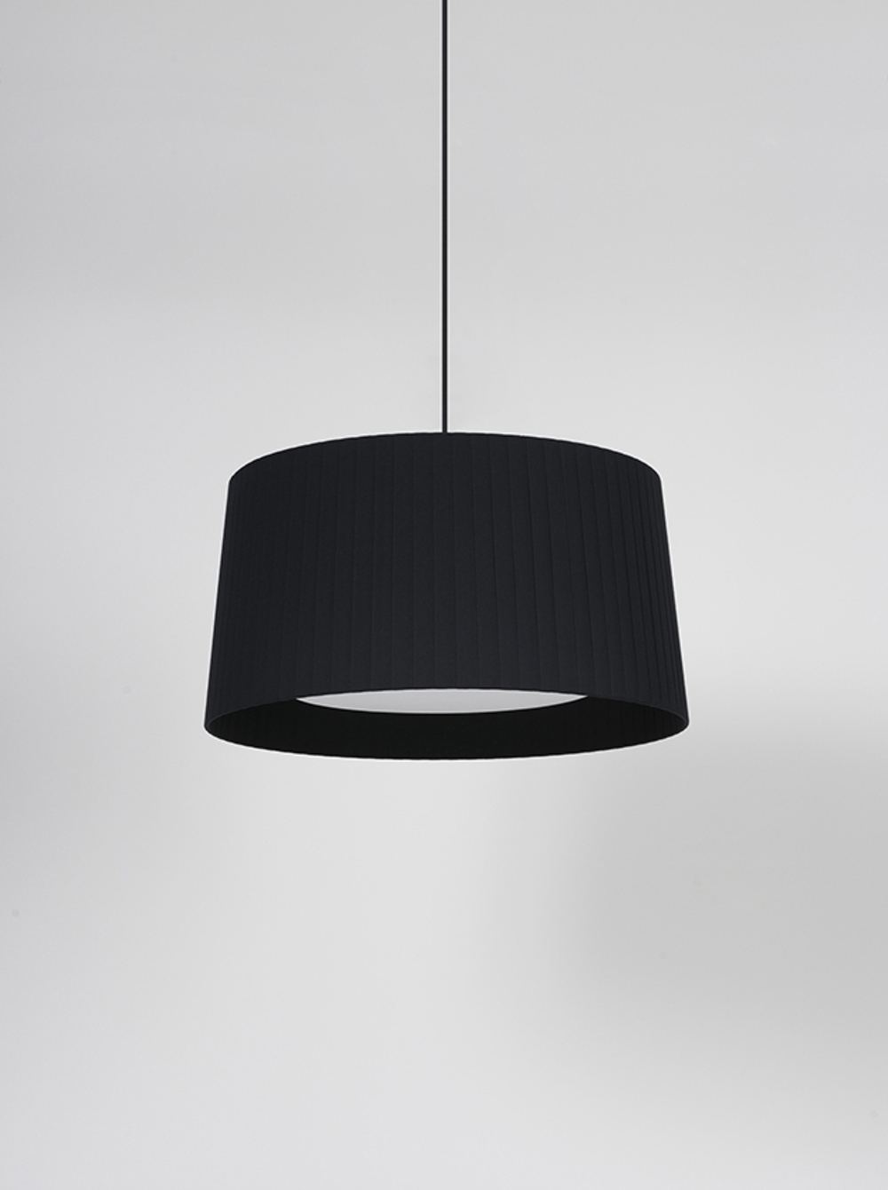 Santa & Cole GT5 hanglamp, zwarte kap met zwart snoer & witte plafondkap.