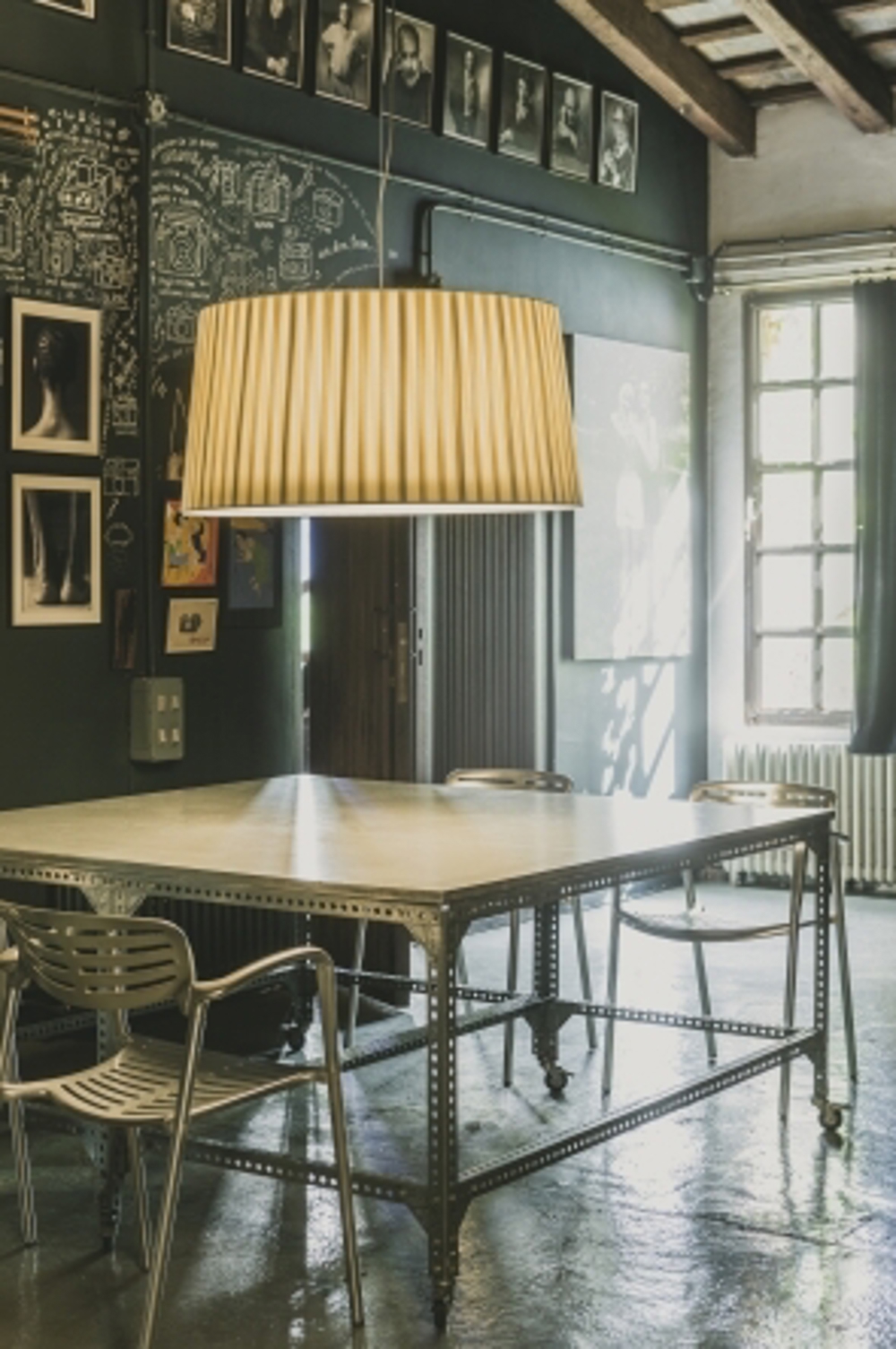 De kap van de GT7 hanglamp is gemaakt van boekbindersstof en is bekleed met banden van perkamentstof.