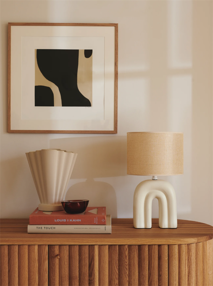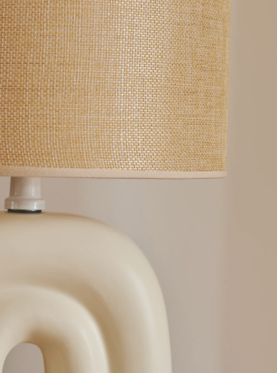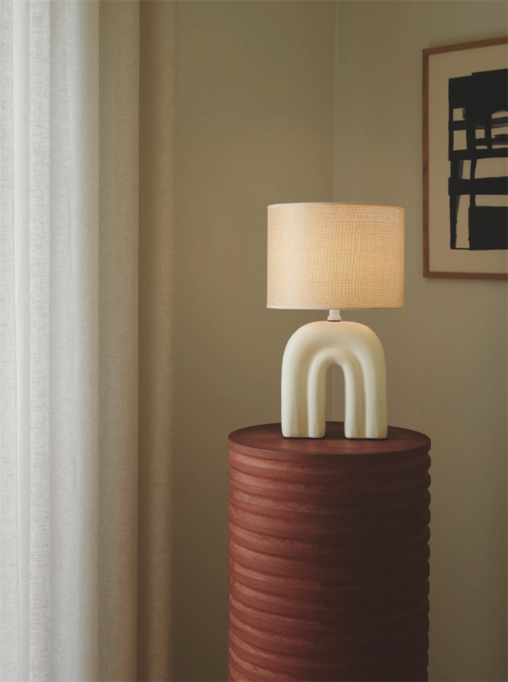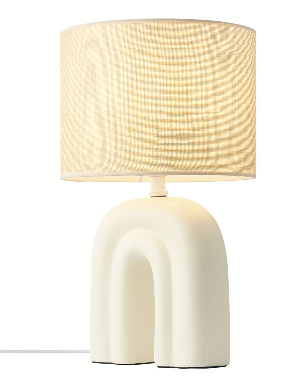 Haze tafellamp heeft een mooie en decoratieve vorm - en is vervaardigd uit een combinatie van een keramische basis en een textiele kap. Deze gebogen en vrouwelijke vorm lijkt bijna op een regenboog in een gedempte, beige kleur. De stoffen kap zorgt voor een aangenaam, warm licht.