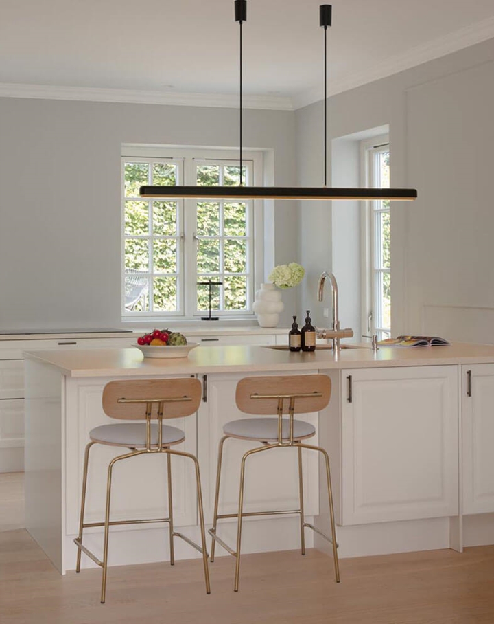 Hazel Branch is met zijn slanke design ideaal als verlichting boven de eettafel en kan ook worden gebruikt als keukenhanglamp of bijvoorbeeld in een vergaderruimte. De langwerpige lamp is zowel functioneel als elegant met een verblindingsvrije LED-lichtbron en biedt de mogelijkheid om de kleurtemperatuur en intensiteit van het licht aan te passen via twee knoppen bovenop de kap.