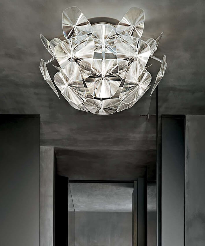 Hope is geïnspireerd door de traditionele kroonluchters, die door Luceplan opnieuw zijn geïnterpreteerd. De Hope plafondlamp is gemaakt van materialen zoals polycarbonaat, waarbij de structuur van de schermen is gemaakt van gepolijst roestvrij staal. Daarnaast heeft de lamp prismatische lenzen die het licht op een kristalachtige manier in de ruimte reflecteren.
