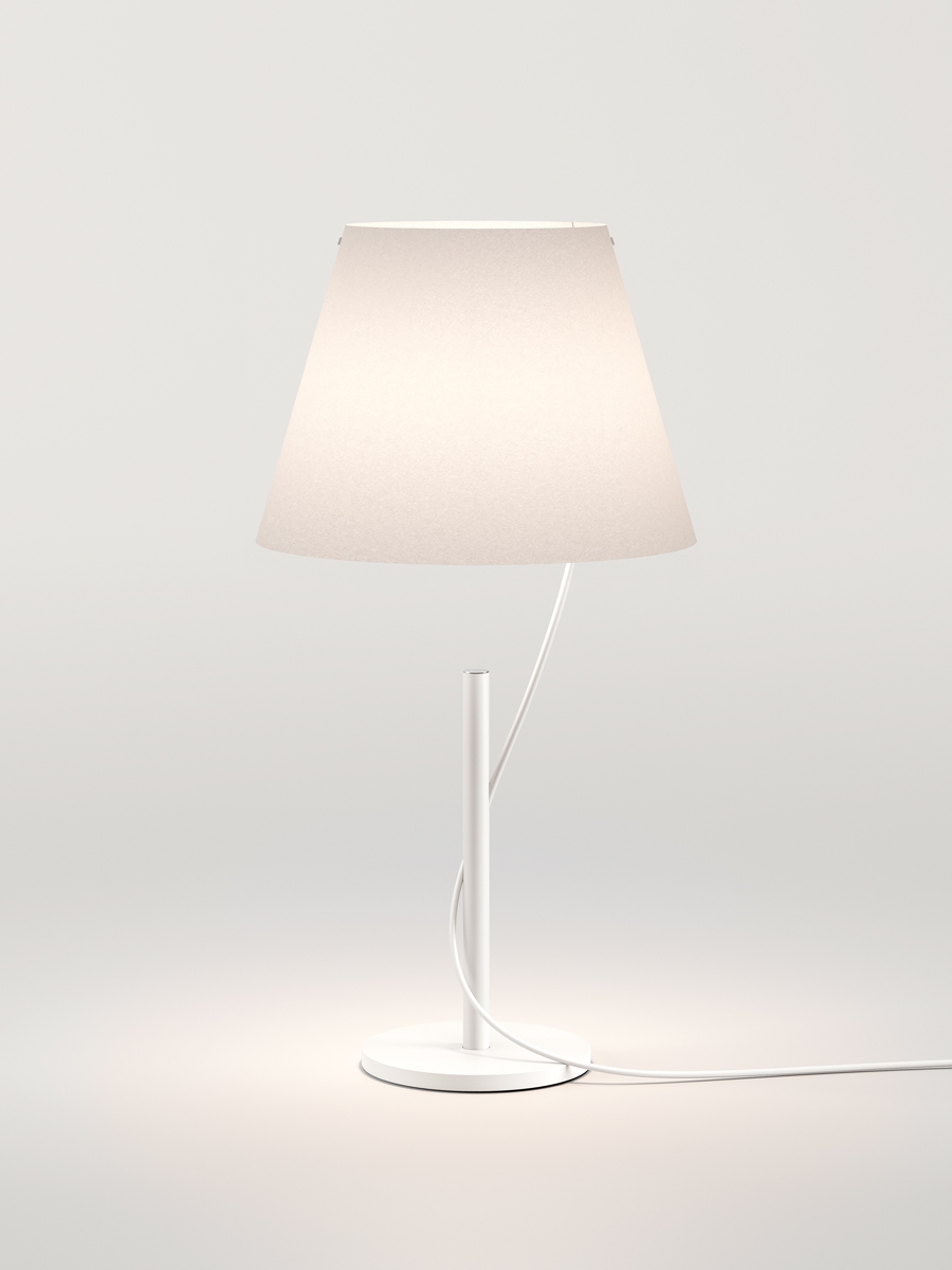 De Hover tafellamp is ontworpen met een lampenkap die lijkt te zweven boven de lampvoet - alleen verbonden met een enkele kabel die door de steel loopt en aan de andere kant eruit komt. Dit geeft de lamp een lichte uitstraling.