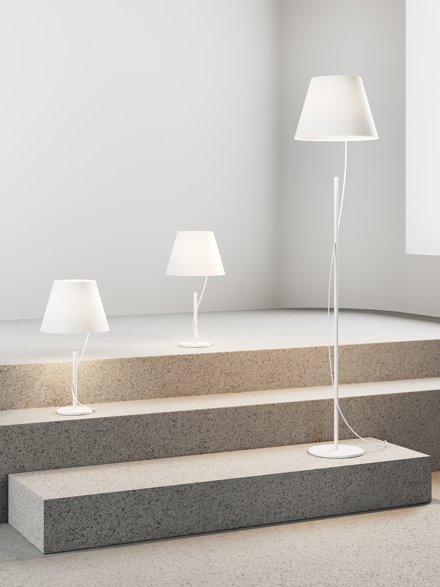 Hover is verkrijgbaar als zowel tafellamp (hoogte: 51,2 cm) als vloerlamp (hoogte: 149,2 cm).