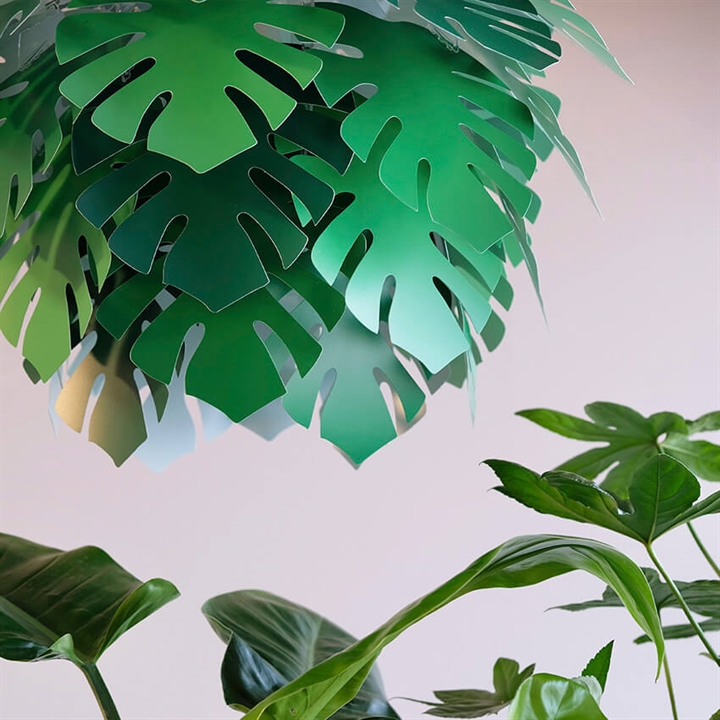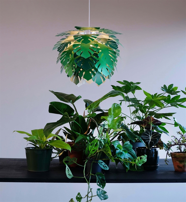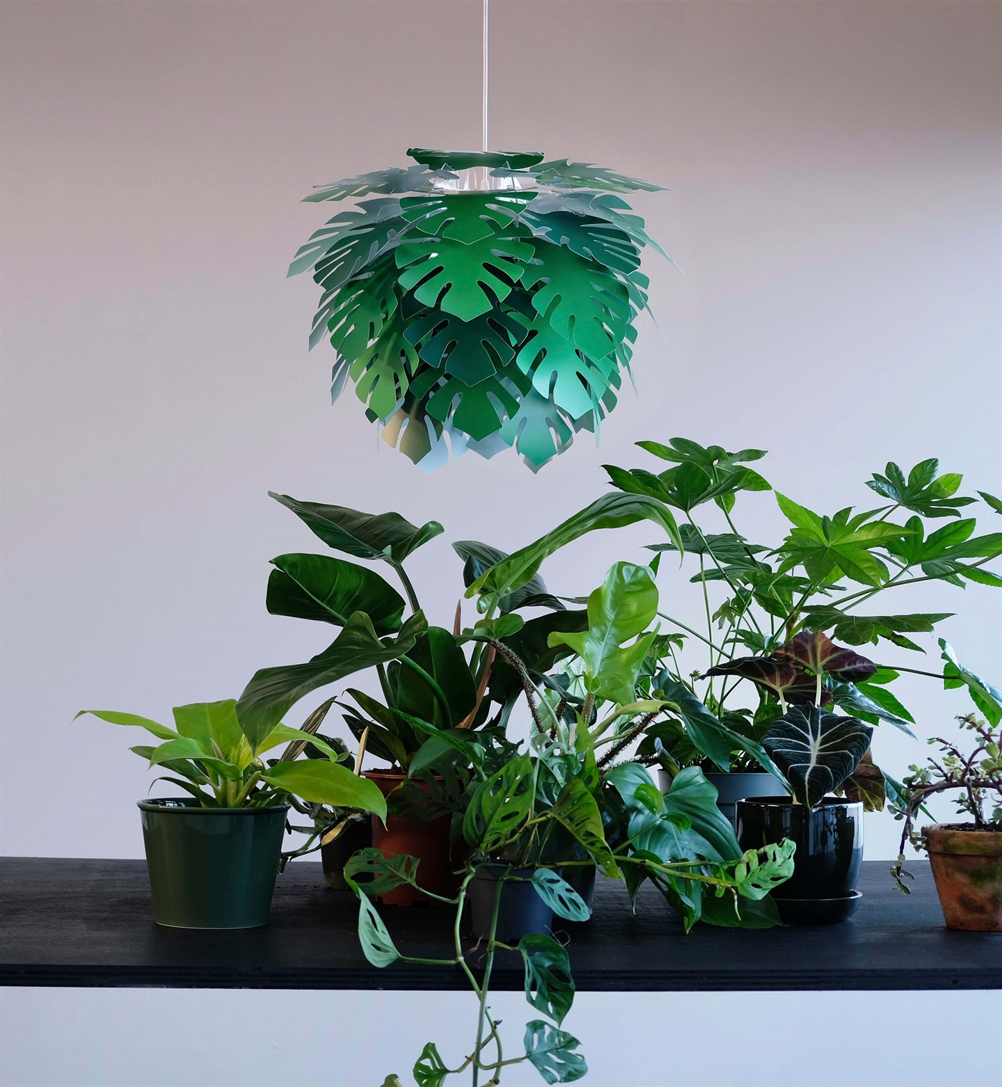 De hanglamp heeft een geheel eigen uitstraling en lijkt bijna op een plant met de vele groene bladeren, waar de inspiratie voor het ontwerp ook van de plant Philodendron komt.