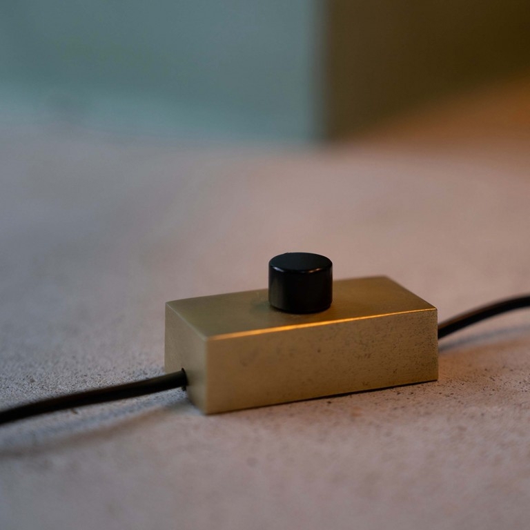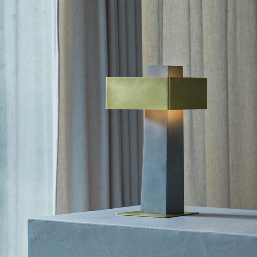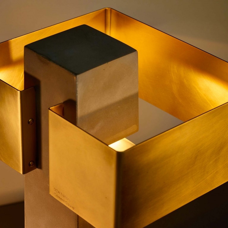 De tafellamp bestaat uit een basis van beton en een kap van messing.