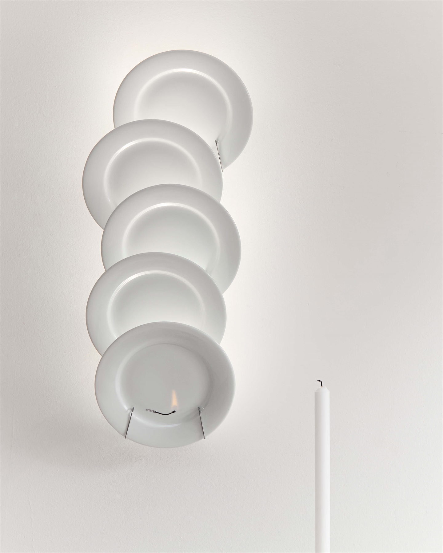 Jasna Kuchnia is een poëtische wandlamp, die alledaagse voorwerpen nieuw leven geeft. Een eenvoudig bordenrek is omgetoverd tot een prachtig lichtobject opgebouwd uit vijf witte porseleinen borden, die in een rustige compositie zweven. Achter het porselein verbergt zich een smalle LED-strip, die het materiaal van binnenuit laat gloeien en fijne nuances van licht en schaduw onthult. Het resultaat is een andere wandlamp met een levendig en licht uiterlijk, die een uitstekende keuze is als verlichting in de keuken of eetruimte.