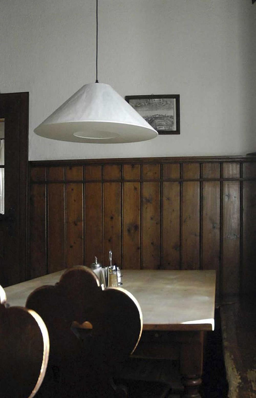 De eenvoudige lampenkap is handgemaakt van Japans papier in München. Als onderdeel van het ontwerp is de kap bewust een beetje gekreukt.