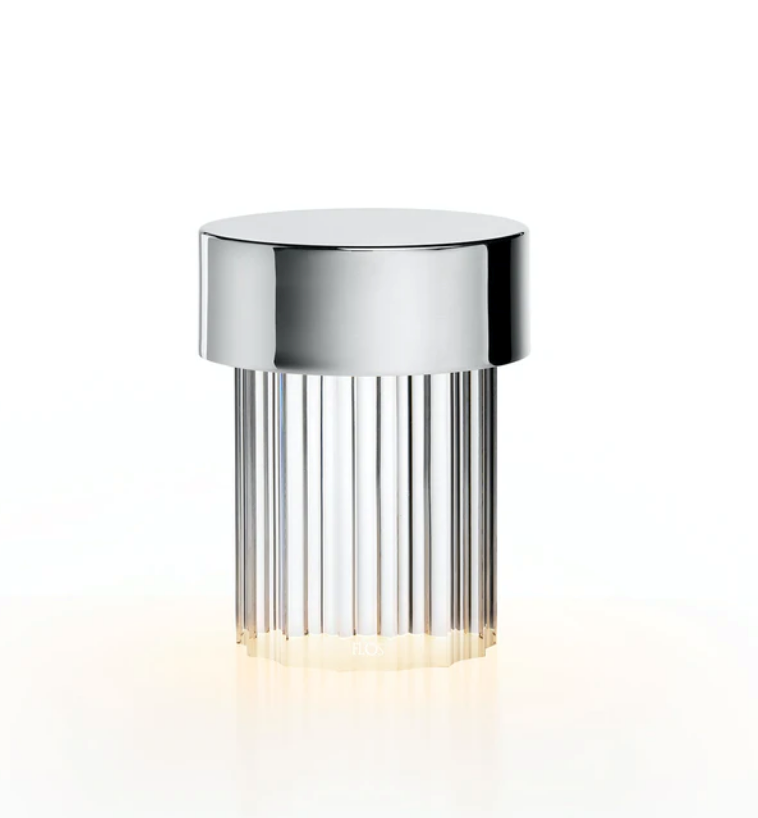 Flos Last Order is een oplaadbare tafellamp die het licht verspreidt door een transparante massieve glasbasis, waarvan de vorm verwijst naar de architectonische typologie van de antieke zuil. Het bovenste deksel is verkrijgbaar in een combinatie van verschillende metaal- en kleurafwerkingen: roestvrij staal, messing, satijn koper of groene opaal coating