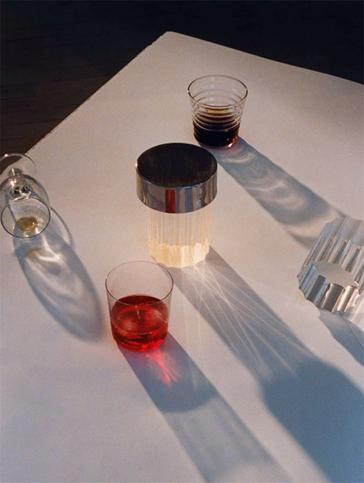 Flos Last Order is een oplaadbare tafellamp die het licht verspreidt door een transparante massieve glazen basis, waarvan de vorm verwijst naar de architectonische typologie van de antieke zuil. Het bovenste deksel is verkrijgbaar in een combinatie van verschillende metaal- en kleurafwerkingen: roestvrij staal, messing, satijn koper of groene opaal coating