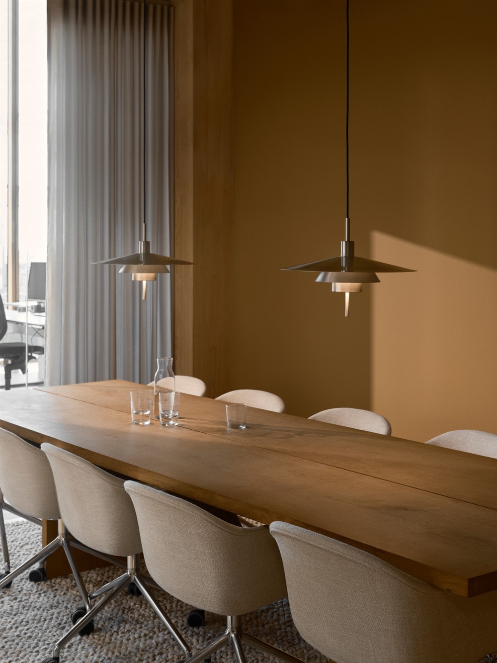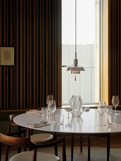 De hanglamp heeft een zacht en niet-verblindend licht en is geschikt als verlichting boven de eettafel en het kookeiland of in de woonkamer. Het minimalistische design vormt een elegante geometrische silhouet, terwijl de geborstelde chroomfinish van de metalen kappen zorgt voor een koele en tijdloze uitstraling. Met een afneembare stang onderaan de hanglamp kun je het uiterlijk van de lamp zelf aanpassen.