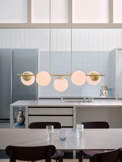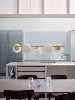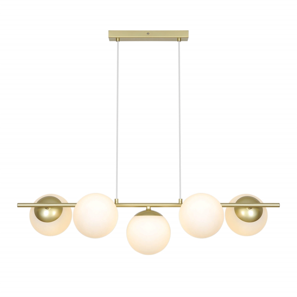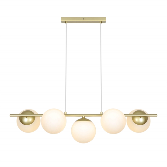 De hanglamp Lilly 5-spot met vijf mondgeblazen bolvormige kappen van wit opaalglas verspreidt een zacht en aangenaam licht en creëert een warme sfeer boven de eettafel of in de woonkamer, hal of slaapkamer. Het design combineert moderne minimalisme met verfijnde elegantie en heeft een metalen structuur met messing afwerking, die prachtig samengaat met de lichtgevende opaalwitte glazen bollen.