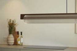Lirra geeft een indirect warm licht van de geïntegreerde LED-lichtbron, die via een wandschakelaar kan worden gedimd. De kap met helder, horizontaal geribbeld glas reflecteert het licht prachtig, terwijl de basis met tijdloze afwerking in dark coffee of messing de hanglamp een exclusieve uitstraling geeft.