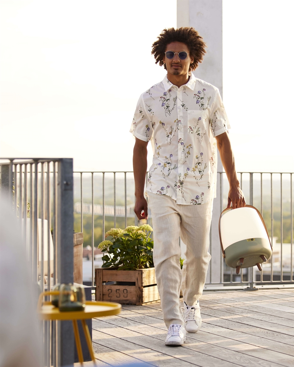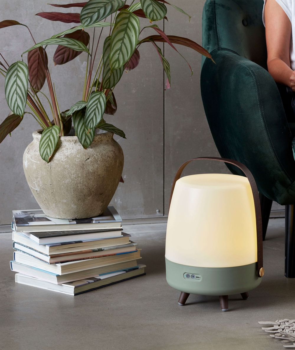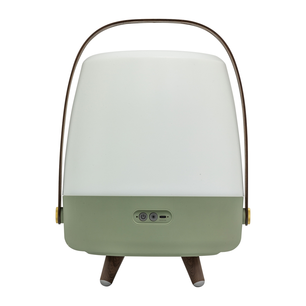 Kooduu lamp trekt de aandacht in elk interieur. Lite-up Play heeft een behuizing van wit PE en een handvat van donker hout. De speakerlamp kan zowel binnen als buiten worden gebruikt, mits deze na gebruik binnen wordt gehaald.