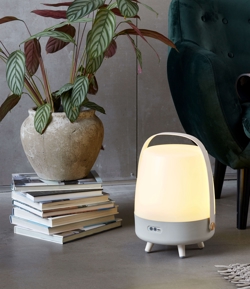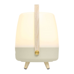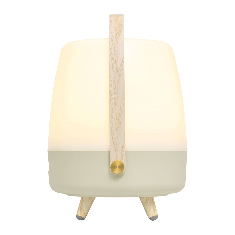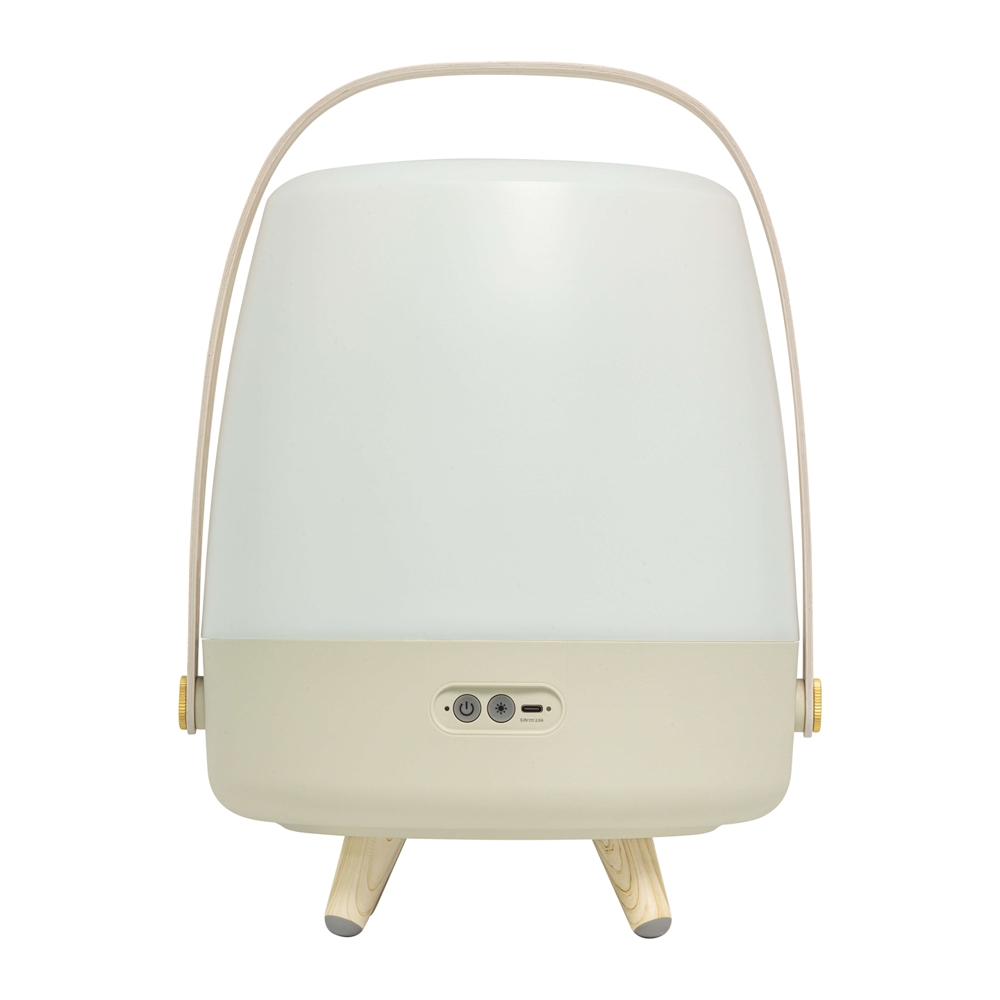 Kooduu lamp trekt de aandacht in elk interieur. Lite-up Play heeft een behuizing van wit PE en een handvat van donker hout. De speakerlamp kan zowel binnen als buiten worden gebruikt, mits deze na gebruik binnen wordt gehaald.