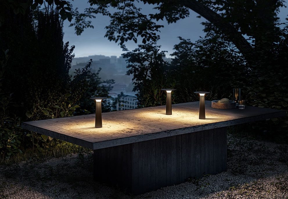 De tafellamp Lix is verkrijgbaar in verschillende afwerkingen, waarvan de meeste zijn ontworpen voor zowel binnen- als buitengebruik. De varianten in messing, chroom en donker chroom worden alleen voor binnengebruik aanbevolen. De serie omvat ook de kleinere variant Lix mini.