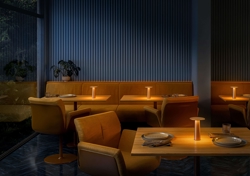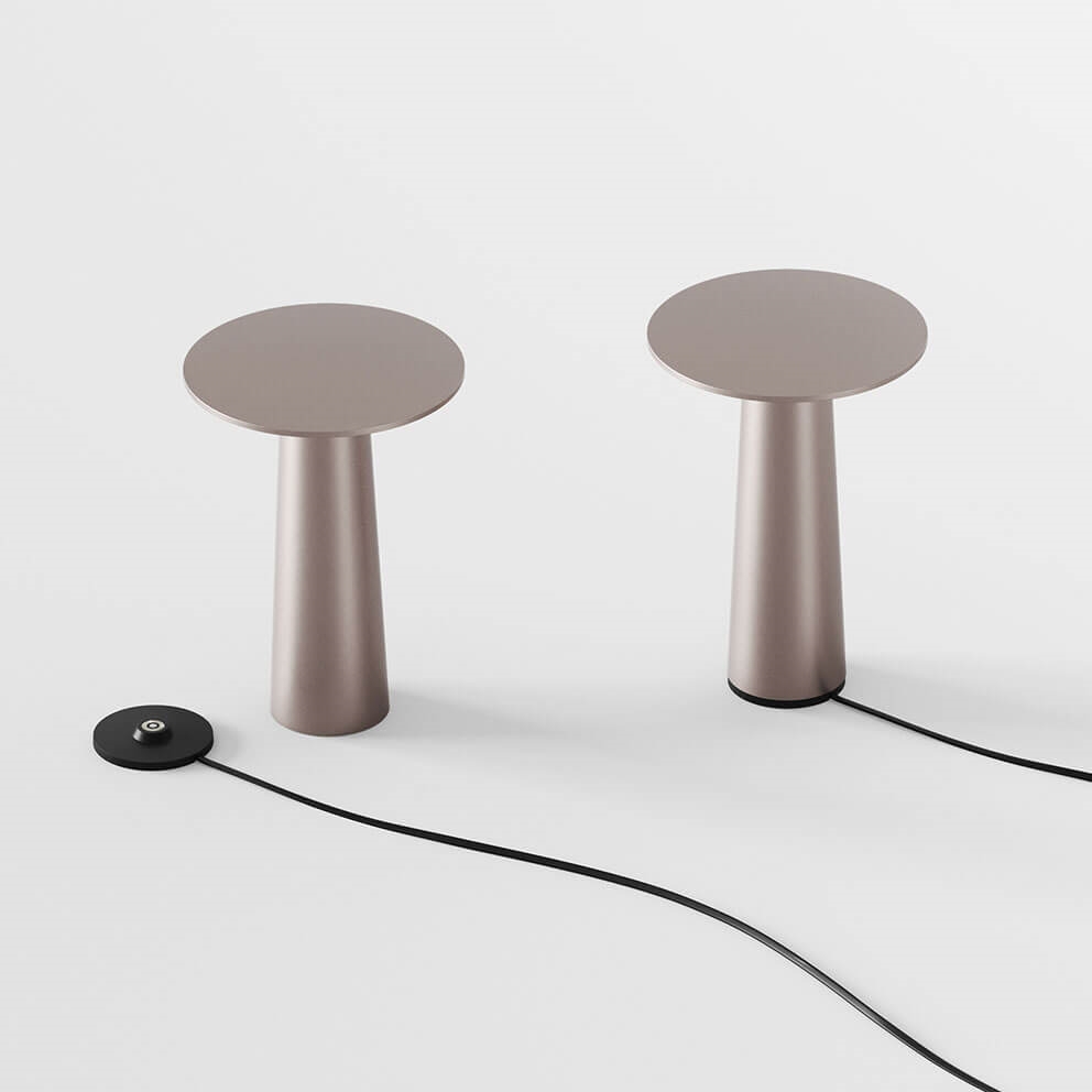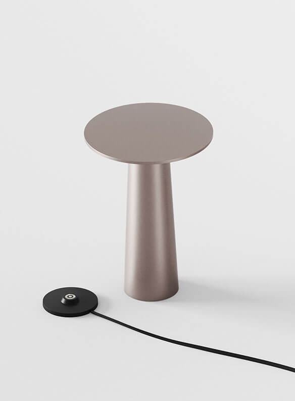 De batterijlamp Lix mini met een lichte bronzen afwerking is gemakkelijk mee te nemen en kan worden aangepast aan elke sfeer met een geïntegreerde dimbare LED-lichtbron, die kan worden gedimd van warm wit op 2700K tot de gezellige gloed van kaarslicht op 1800K. De draagbare tafellamp kan, afhankelijk van de gekozen dimstand, tussen 5 en 48 uur branden voordat hij op de meegeleverde laadbasis moet worden geplaatst en opnieuw moet worden opgeladen.