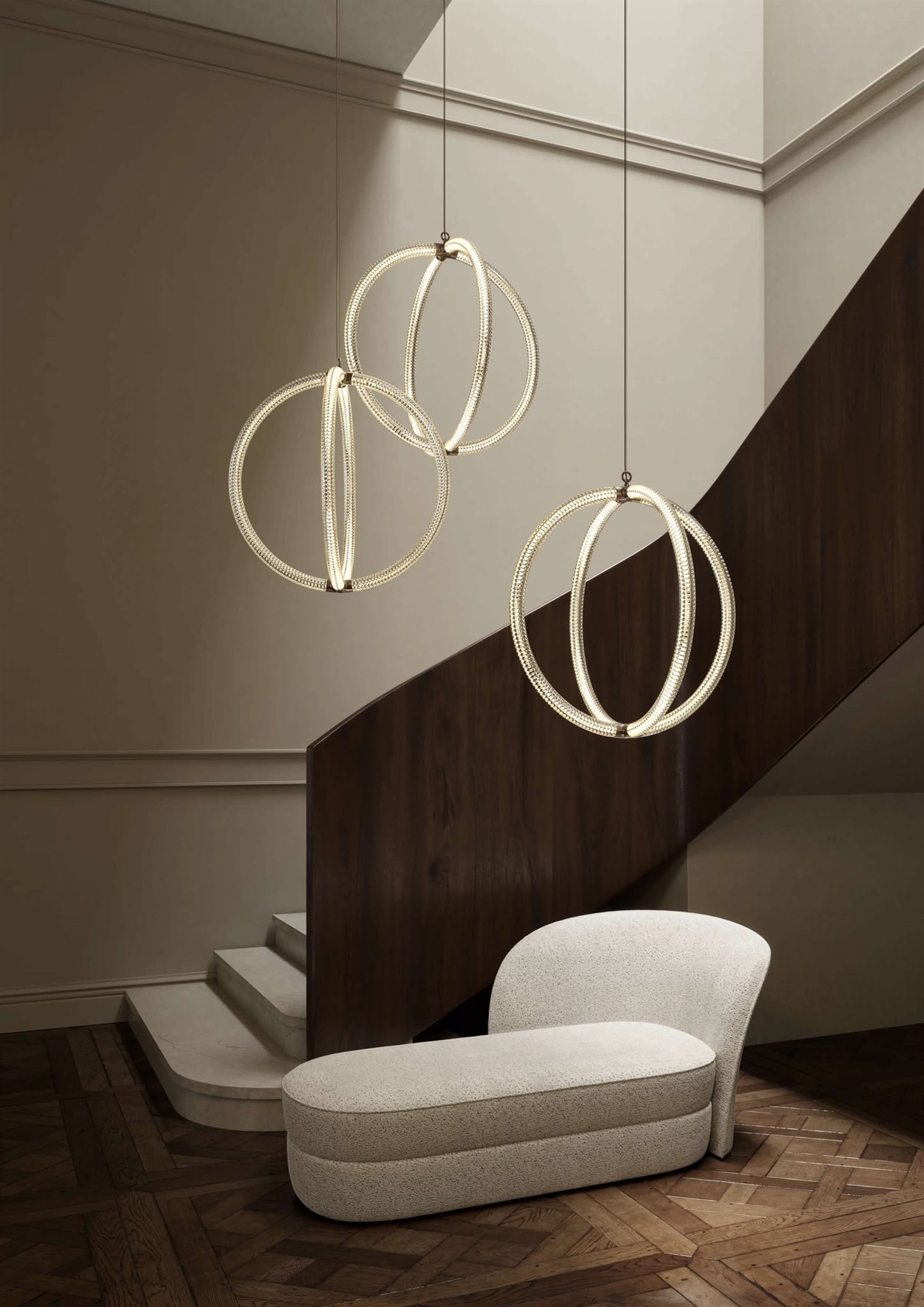 Luminora is geïnspireerd door Murano-glas en de wiskundige elegantie van de gulden snede. De lamp verenigt eenvoud en complexiteit en past goed in veel interieurs. Gebruik de hanglamp bijvoorbeeld als verlichting boven de eettafel, als sculpturaal element in de woonkamer of als uitnodigend licht in de hal.