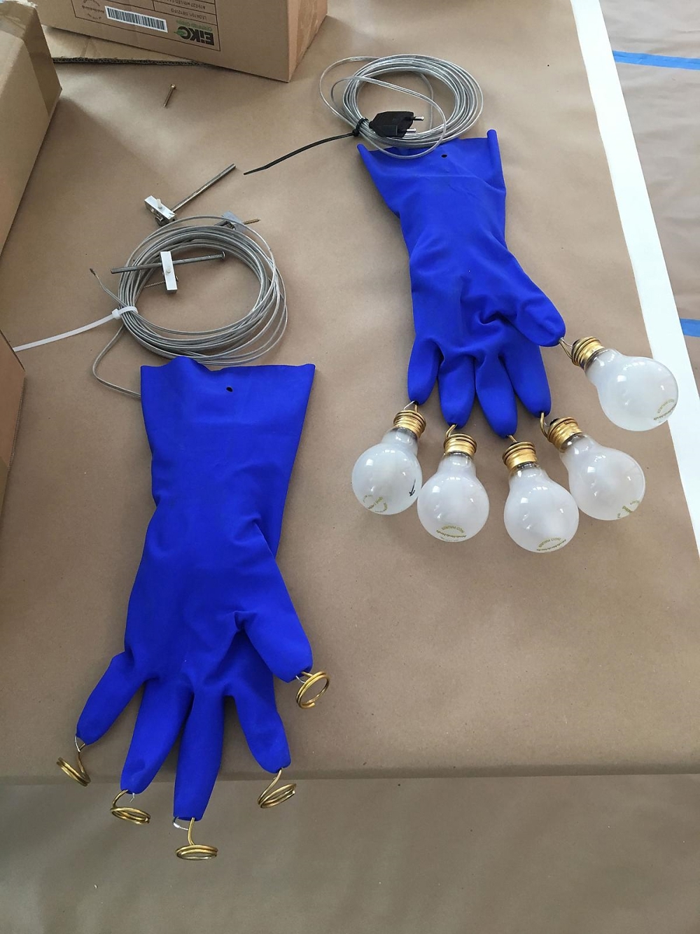 Een blauwe handschoen met matte lampjes op de punt van de wijsvinger. Verrassend en onconventioneel. Controversieel, vrij van geremde gedachten en verveling door het doordachte ontwerp. De hanglamp is gemaakt van kunststof, metaal en laagspanningslampen. Elke handschoen is met een speciale kleur handmatig geschilderd. Luzy is gemaakt met linker- en rechterhandschoenen.