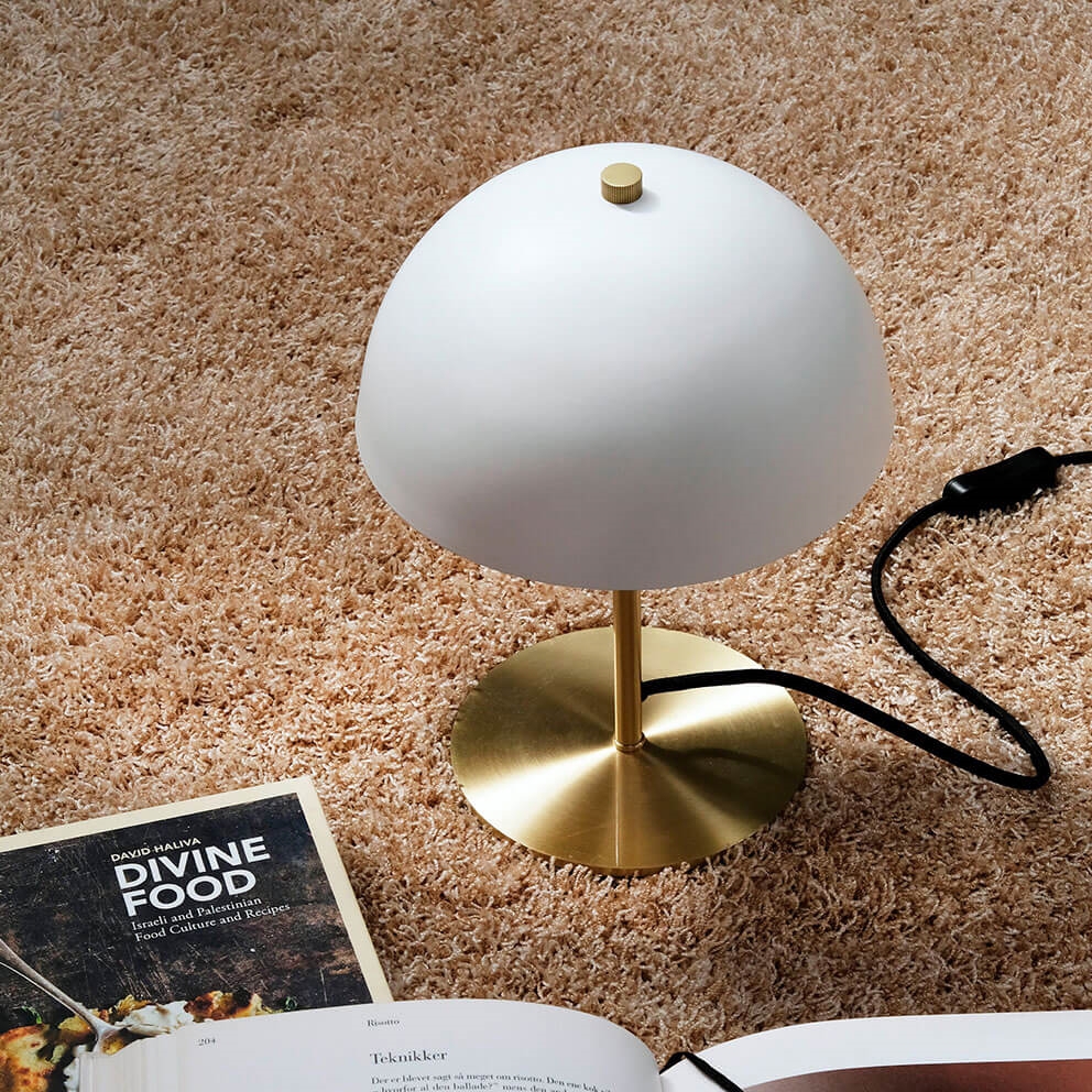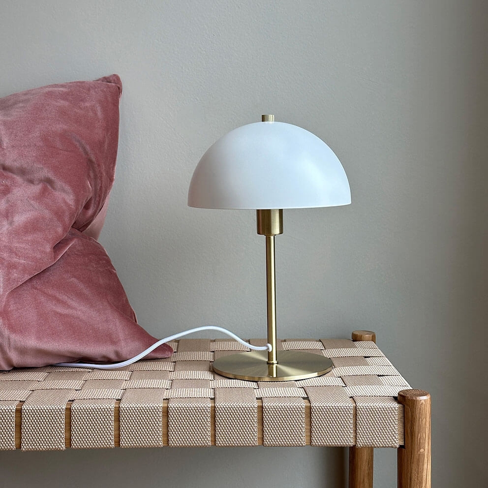 Tafellamp Malmø in een strak design in mat wit en messing past perfect bij veel interieurs. De lamp is een verfijnde en exclusieve toevoeging aan elke ruimte en kan bijvoorbeeld op een bureau, plank of nachtkastje worden geplaatst. De aan/uit-knop bevindt zich op het snoer.