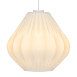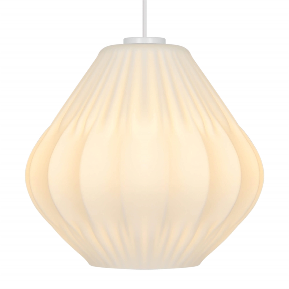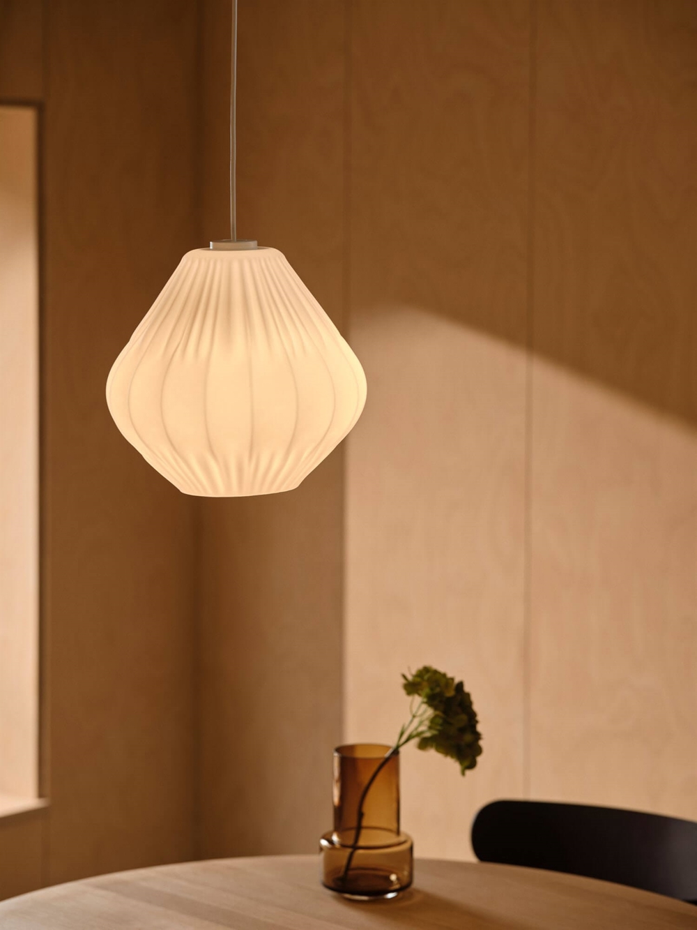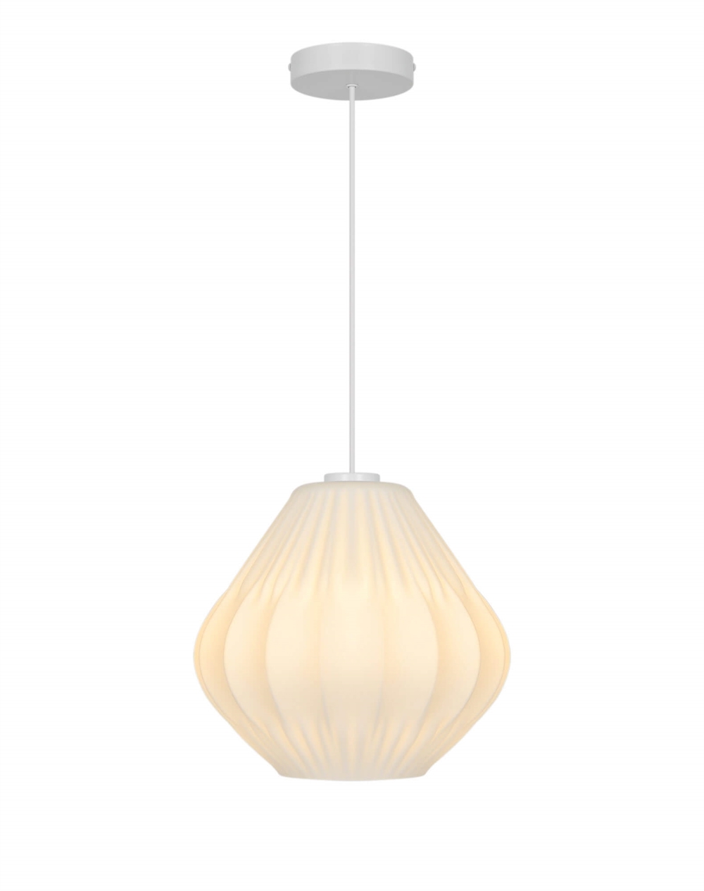 Maluca’s stijlvolle uitstraling is geïnspireerd op klassiek lampdesign met geplisseerde kappen en is gemaakt van mat wit opaalglas.