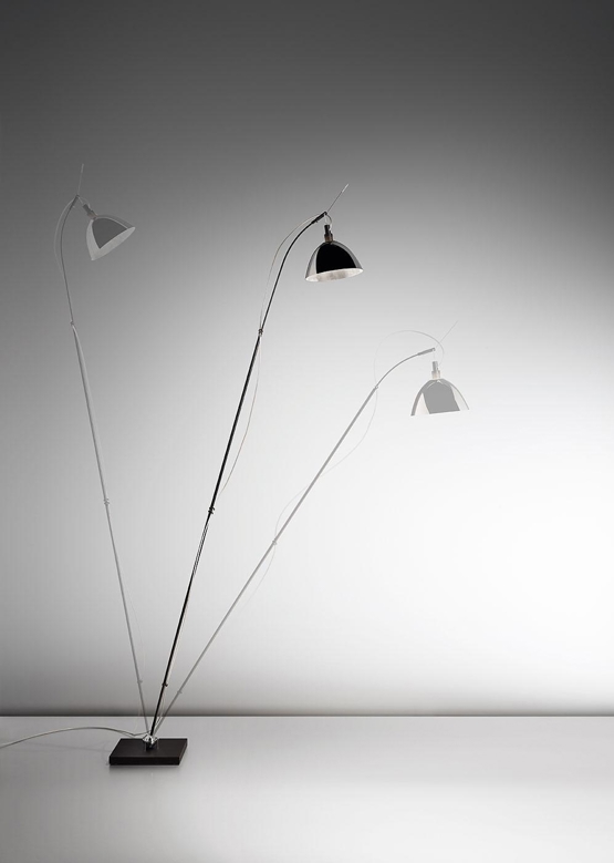 Ingo Maurer Max. Vloerlamp is gemaakt van puur aluminium en roestvrij staal. De kogelgewricht maakt het mogelijk om de lamp in alle richtingen te draaien en kantelen. De reflector (met handvat) kan in alle richtingen worden gedraaid. De reflector van puur aluminium is spiegelglad of gelakt in zwart.