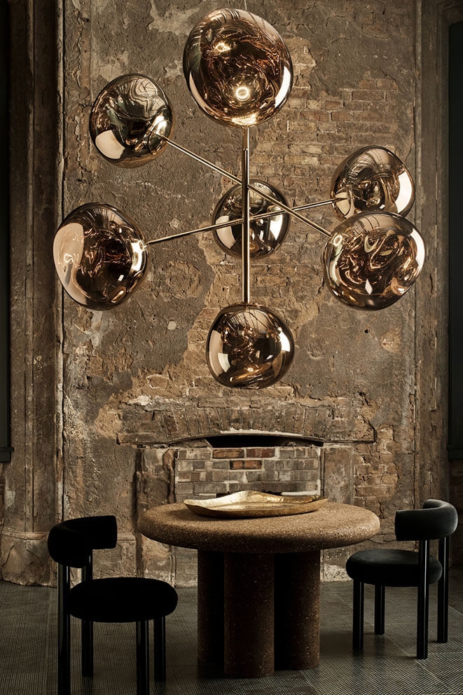 Melt grote kroonluchter bestaat uit zeven gemetalliseerde onvolmaakte bolvormige kappen met een spiegeleffect, die zo zijn gemonteerd dat ze vanuit de basis zweven en een dynamisch lichtsculptuur vormen.