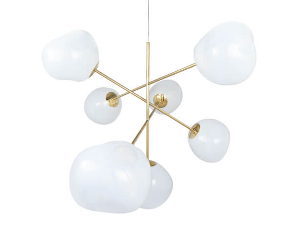 Melt grote kroonluchter is verkrijgbaar in de varianten zilver, koper, goud, rook, opaal/zilver en opaal/goud. Er is ook een mini en een kleine versie.