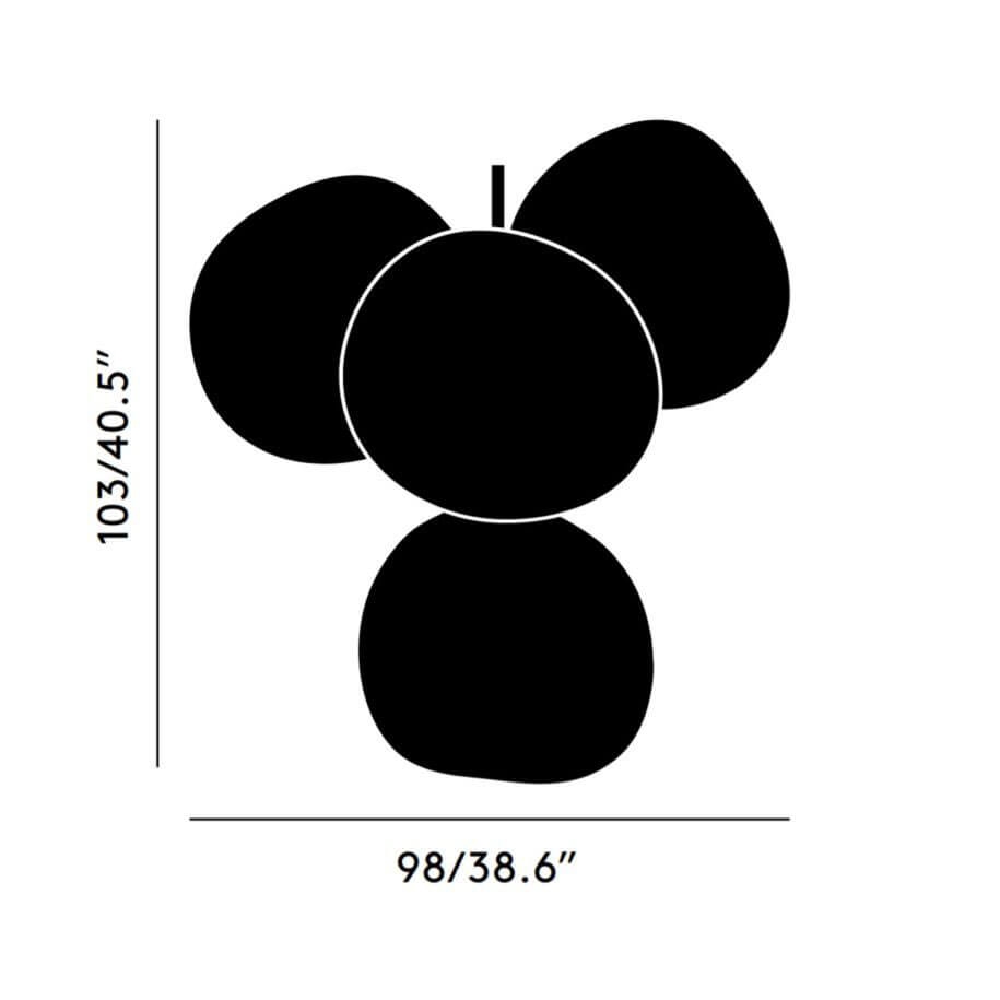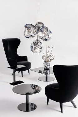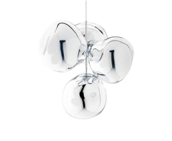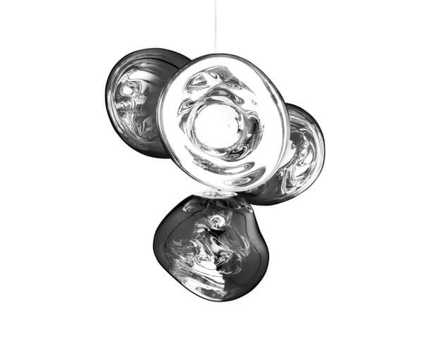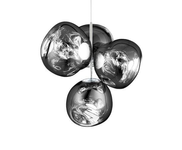 Melt kleine kroonluchter is een herinterpretatie van de moderne kroonluchter en bestaat uit vier gemetalliseerde onvolmaakte bolvormige kappen met een spiegeleffect, die zijn gemonteerd om een kleine cluster te vormen.